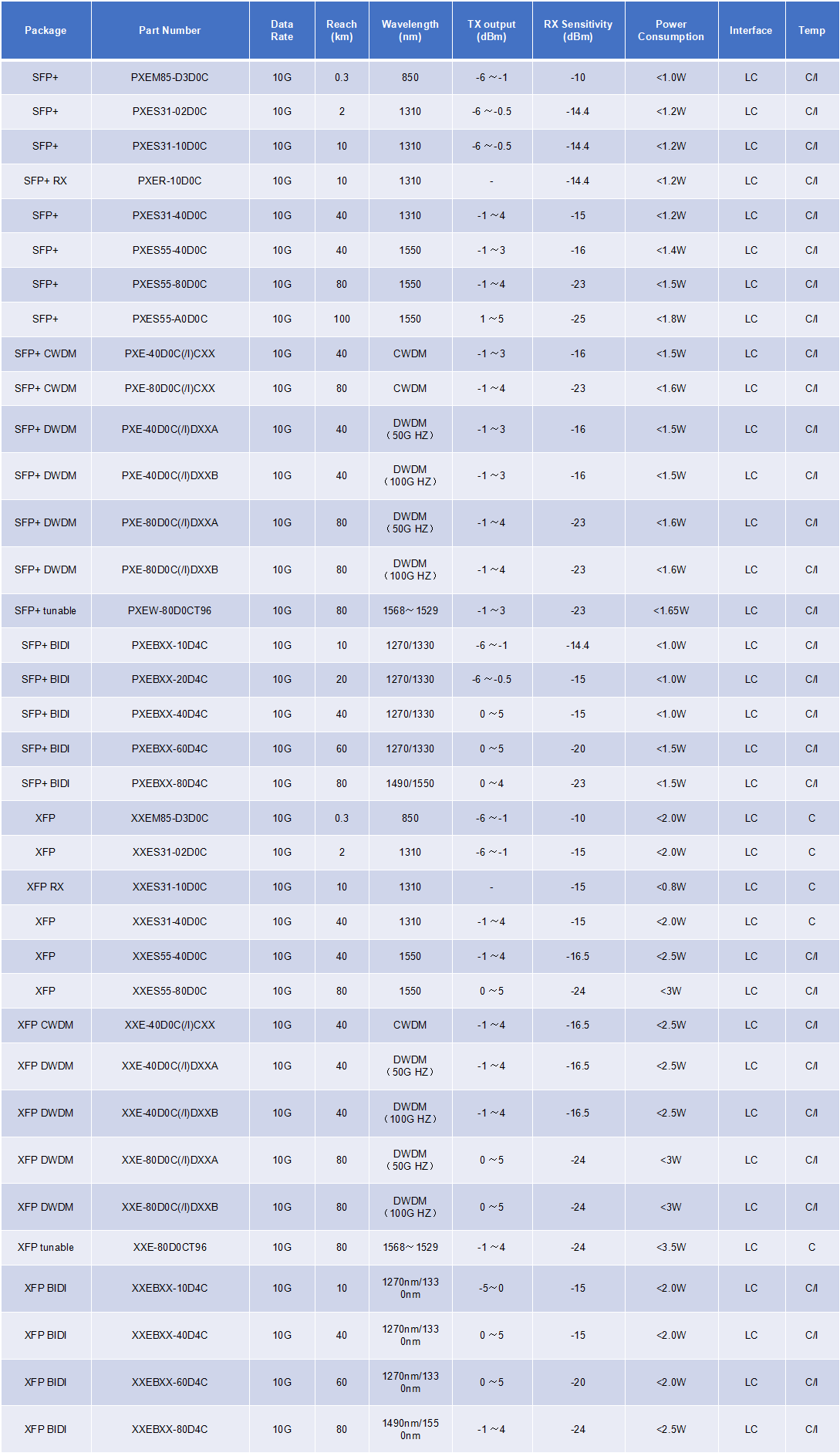 Mind Tech’s 10G SFP+ and XFP include SR, LR, ER, ZR, CWDM/DWDM, BIDI series, complaint with MSA, SFF-8472, SFF-8431, with the feature of low power consumption, commercial or industrial operation temperature and high reliability, suitable for DC, Metro, Wireless and Transmission networks.