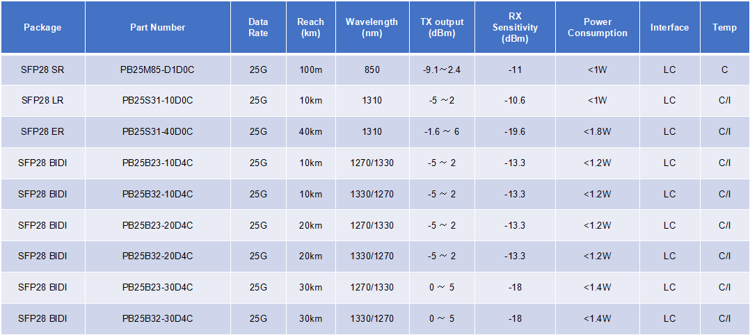 Mind Tech’s 25G SR, LR, Bidi SFP28 optical transceiver, with the features of IEEE802.3 by SFF-8472, low consumption and high reliability, suitable for data center, 25G Ethernet and fiber channel.