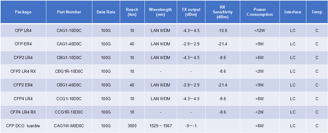 100G CFP/CFP2/CFP4 Mind Tech’s 100G CFP,CFP2,CFP4 series ,with the features of CFP/CFP2/CFP4 MSA,IEEE802.3ba Compliant, low power consumption and dual rate supporting.They can be compatible with Ethernet and OTU4 applications.