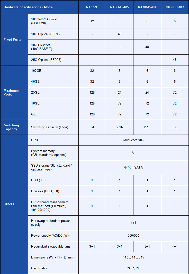 Mind Tech NX3 series versatility switches are designed to operate as the ToR (Top of Rack) switches in the 2-tier Spine-Leaf cloud data center networks. In a standard 1RU space, Mind Tech NX306P versatility switches provide 6 ports of 100G Ethernet interfaces as uplink ports connected to spine switches such as Mind Tech NX532P switches; In addition, Mind Tech CX306P versatility switches also contain 48 downlink ports of the following different interfaces to connect to data center servers